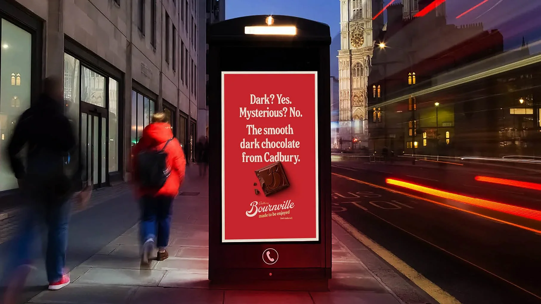 Bournville is a dark chocolate that’s been around for over 100 years. The Dark chocolate world has become increasingly moody.It’s in danger of becoming a pretentious thing fawned over by pretentious people to show how clever and cultured and worldly they are.We created Bournville’s first creative platform in over 50 years to remind people what dark chocolate is all about.Made in collaboration with Alice Goodrich and Si Connor.